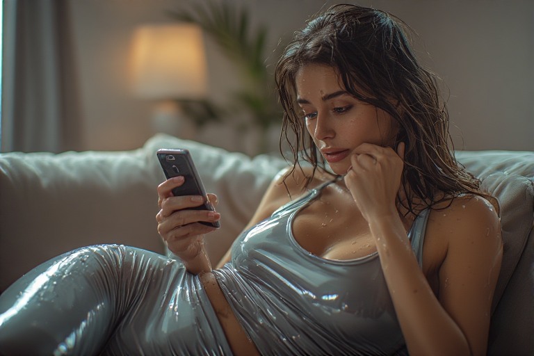 It was one of those quiet moments where a lady finally gets to relax after a long day. She was stretched comfortably across the sofa wearing a gray shiny wetlook outfit that reflected the room’s light like a smooth silver mirror.